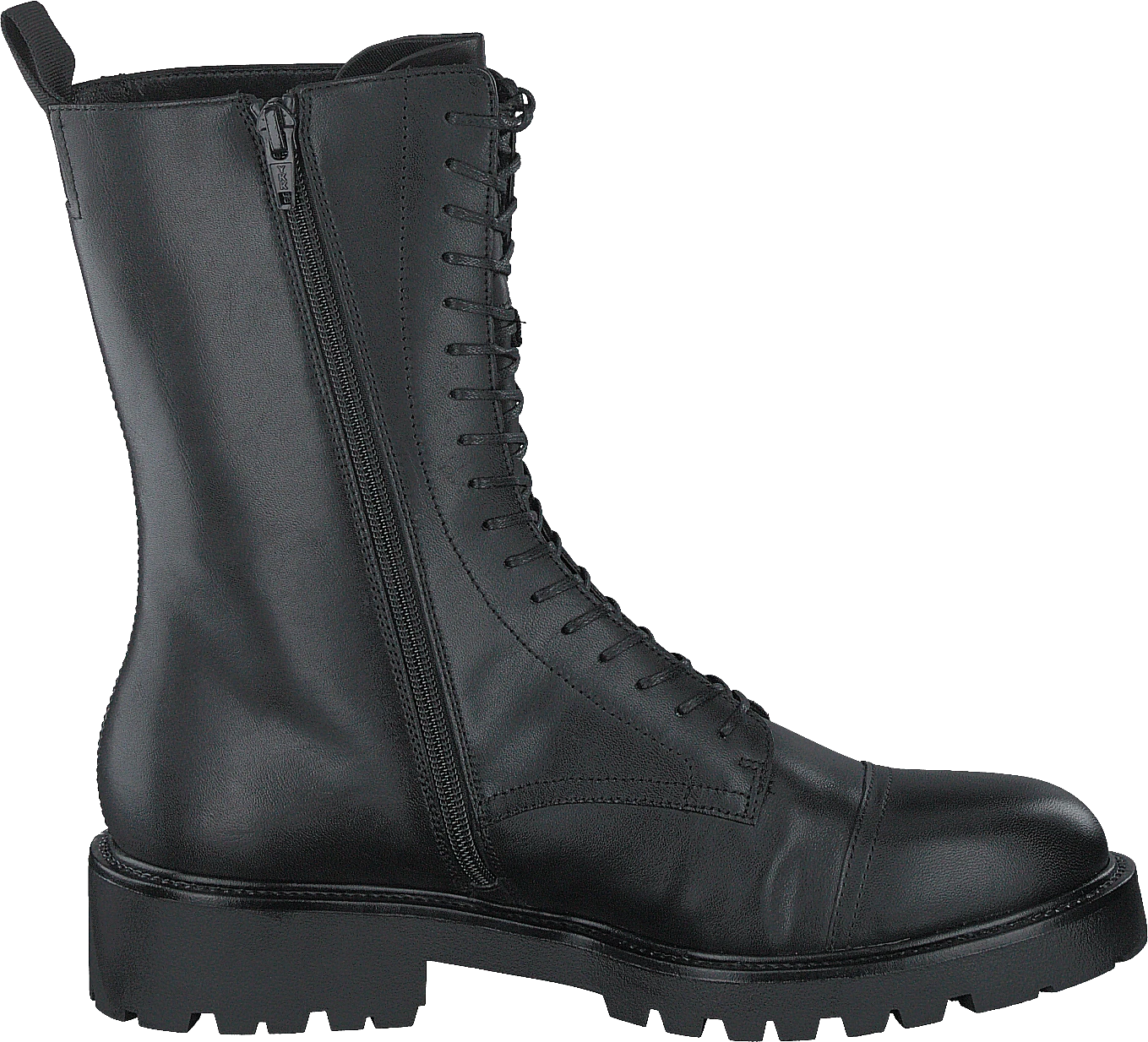 Vagabond Kenova 5241-101-20 har en ovandel i svart gummi med metalldetaljer och metalldragkedjor, snörning framtill, låg klack och yttersula i gummi.